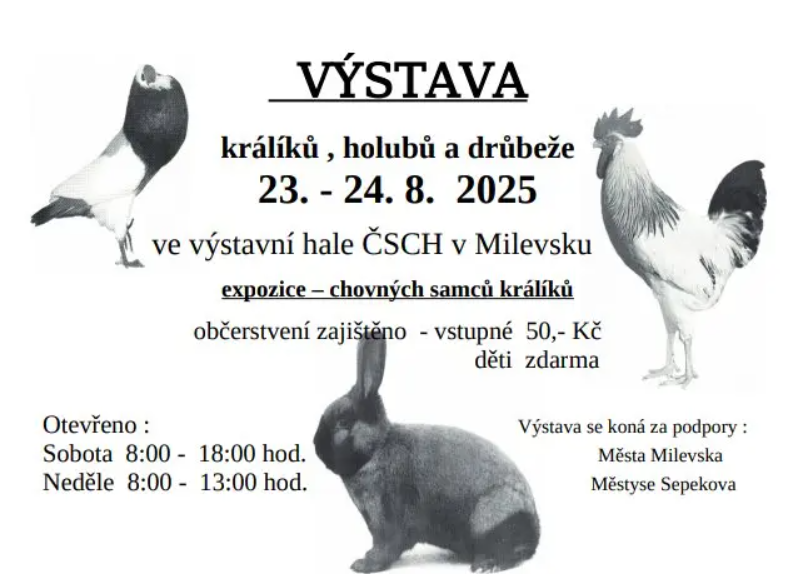 Zveme Vás na výstavu králíků , holubů a drůbeže a expozice chovných samců králíků Ve výstavní hale v Týnické ulici 23. a 24. srpna 2025