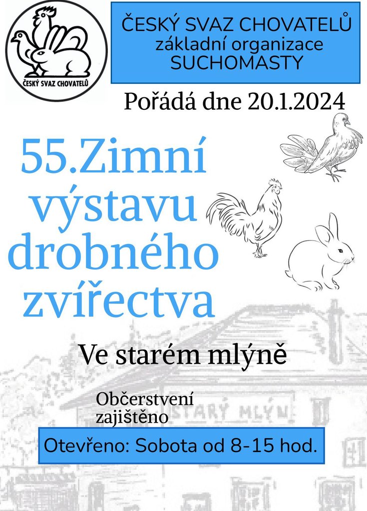 Dobrý den, rádi bychom vás pozvali na letošní 55. výstavu drobného zvířectva ve starém mlýně v obci Suchomasty (okres Beroun).