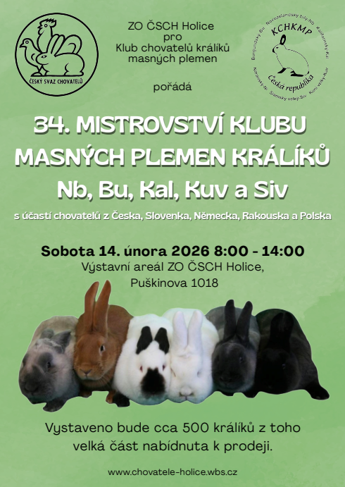 Milovníci chovu králíků, zbystřete. V sobotu 14. února 2026 se v Holice uskuteční prestižní 34. mistrovství Klubu chovatelů králíků masných plemen (KCHKMP). Jedná se o jednu z nejvýznamnějších specializovaných výstav králíků v České republice, která každoročně přitahuje chovatele i veřejnost z celé země i ze zahraničí.